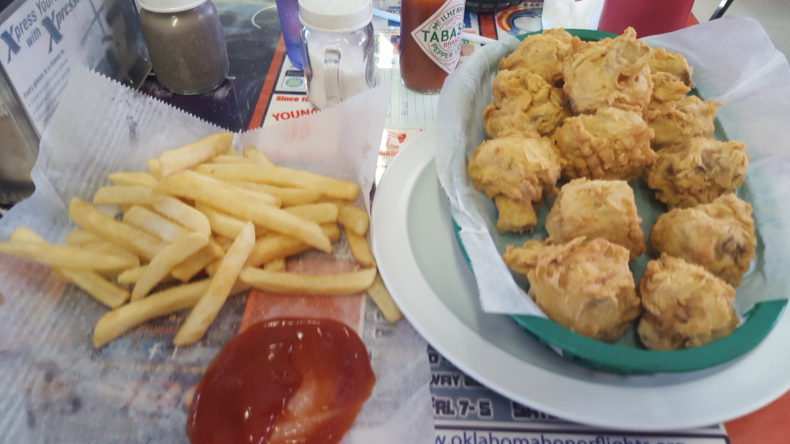 At the next town, I stopped at the local library to rest and do some writing.  The ladies there suggested I stop by The Depot for dinner.  Above are french fries and fried mushrooms!  The mushrooms were too much for one setting so they were also my second dinner.