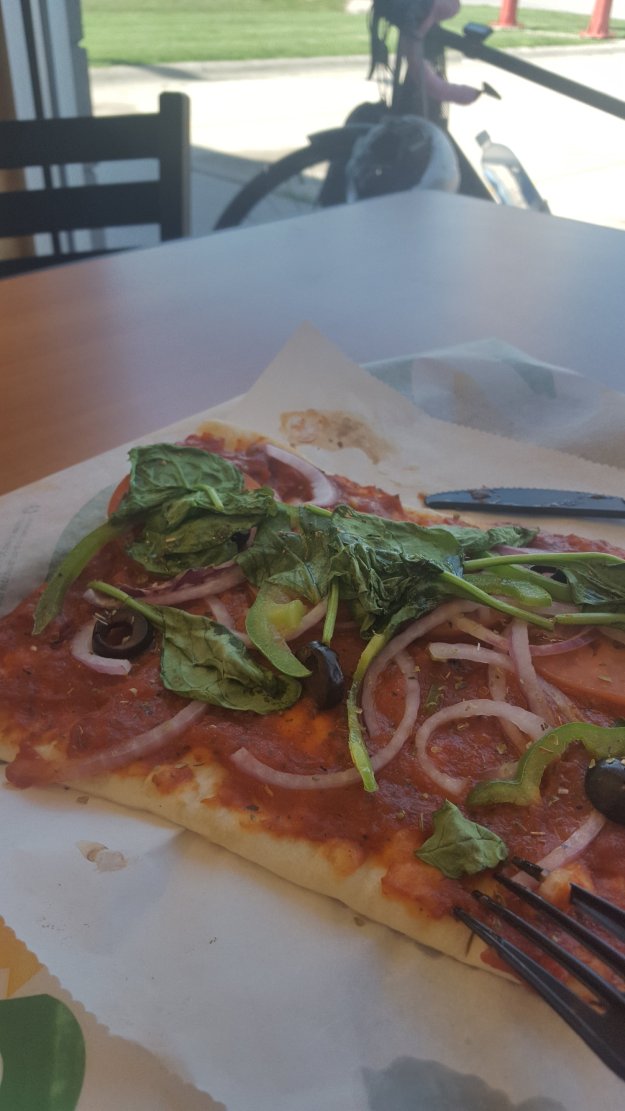Hwy 169 from Coffeeville is a four lane divided highway with a 6 ft paved shoulder. I was making good time with a 20-30 mph tailwind. My legs were fresh after the good night sleep in the barn. I had been craving pizza since I left from Arkansas. I even told my mom to let the family in Chanute know that I will meet them at the pizza parlour. This is the closest I could get to pizza though. It’s a veggie meatball sub (minus meatballs) on a flatbread.