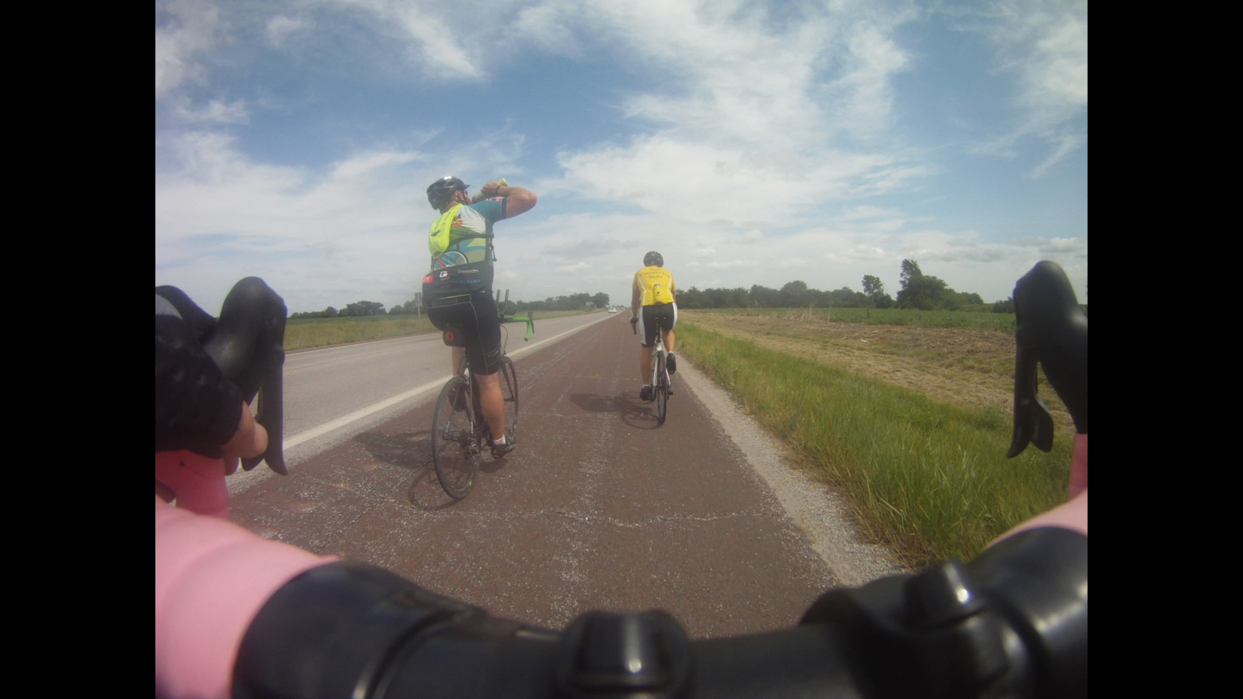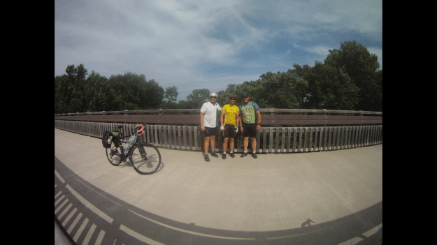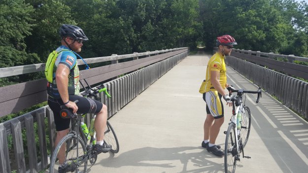 The park was also wear we got on the Prairie Spirit Rail Trail that runs from Humbolt to Ottawa. My spirit was better, but my legs were gone at that point. The trail did not help. Went from semi-smooth pavement to pea gravel. It was a well kept trail. Come to find out you are suppose to pay and have a permit to use it. My pace dropped from an easy 15 to a hard 8. The guys ahead I doubt were even pedaling and I could not keep up. We stopped at a bridge for a little photo-op before trudging on.