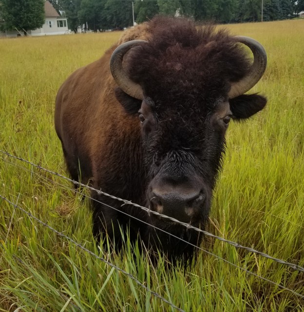 The plan was to leave there and ride to the highway 275 junction and turn south to Clearwater. This would keep me busy and give me the mileage for the day. I was just too tired to make that happen, so I backetracked a few miles to take highway 14 straight south to Neligh. Back in Royal I stopped to pet a buffalo. He kept purring and snorting and pawing at the ground. I think he was happy to see me.