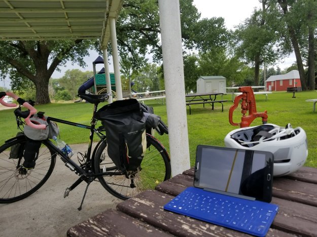 I got a late start and had only ridden 30 miles by noon. I stopped in the tiny town of Wood Lake, population less than 100. They had a quaint diner that had been closed for probably 20 years, a post office, old school, and a city park. The park was very nice. They must have set it up for the Cowboy Trail. They even had a log book for visitors to write in. Most of the cyclists commented on the cold water, since it had been so hot recently. I had another PB&J sandwich for lunch. I started to setup the hammock to relax and the wind started to pick up. In the distance I could see storm clouds, but no rain. I debated staying there and waiting out the storm. Instead, I tried to beat it.