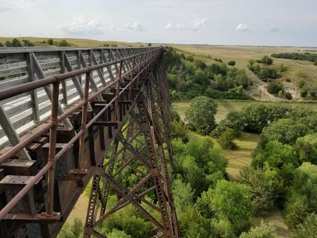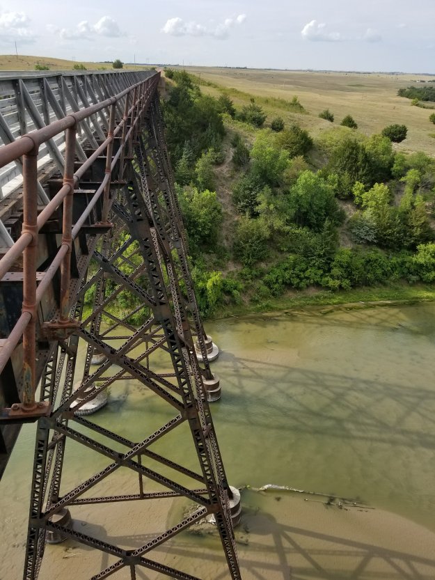 There was a cold wind coming out of the North that did not help my progress. With 5.5 miles to go I see a car pulled over to the side. When I reach him, he waves me down and I ask if everything is alright. George, was a fellow cyclist and just wanted to chat about my trip. We swapped information and decided to meet up after he settled in to his hotel and I set up camp. I remember it being 5.5 miles from Valentine because the bridge on the Cowboy Trail that everyone insisted I see was 4.5 miles from where I met George and from there it was 1 mile to the RV park I stayed in. The bridge was an old railroad bridge built high over the Niabrara River.