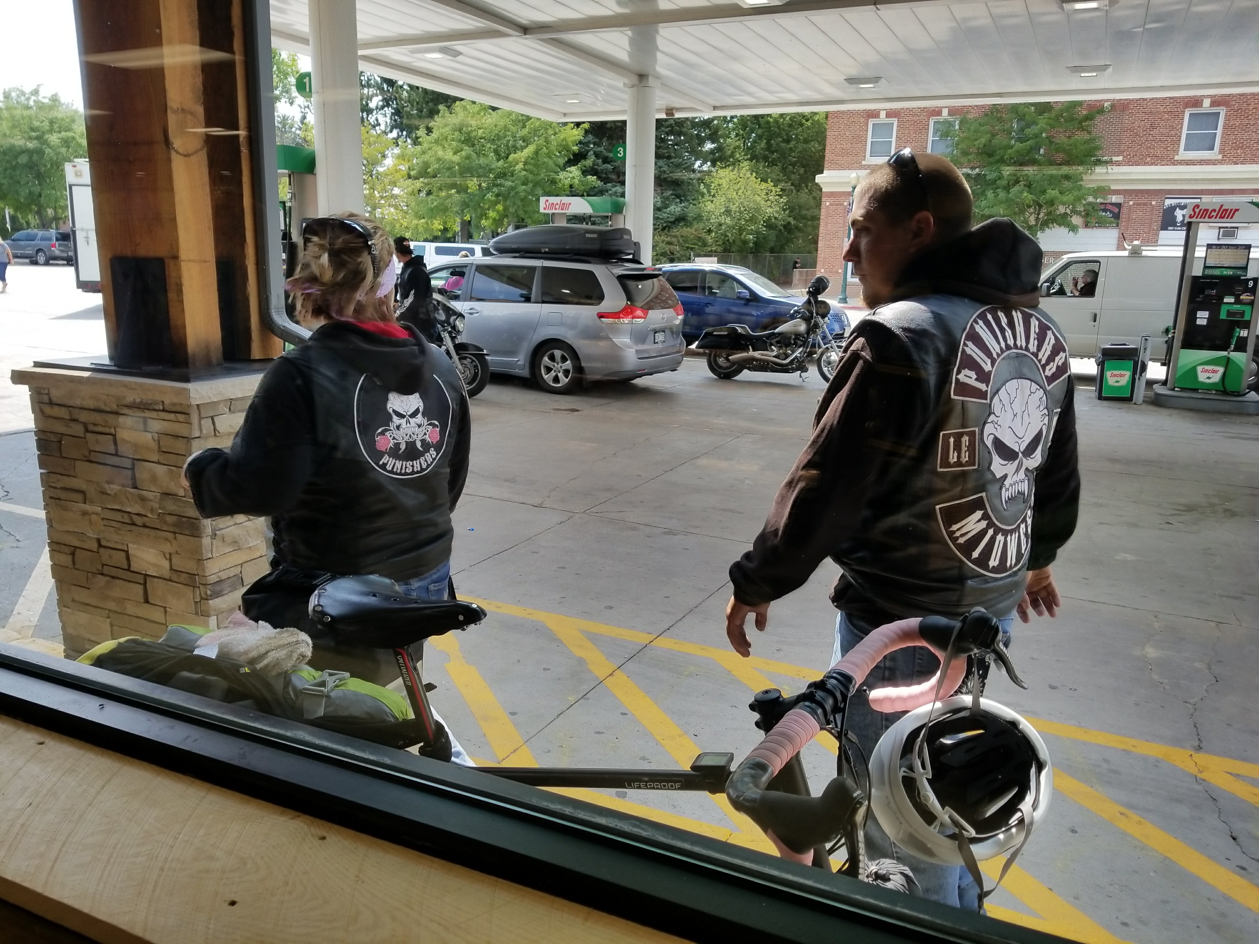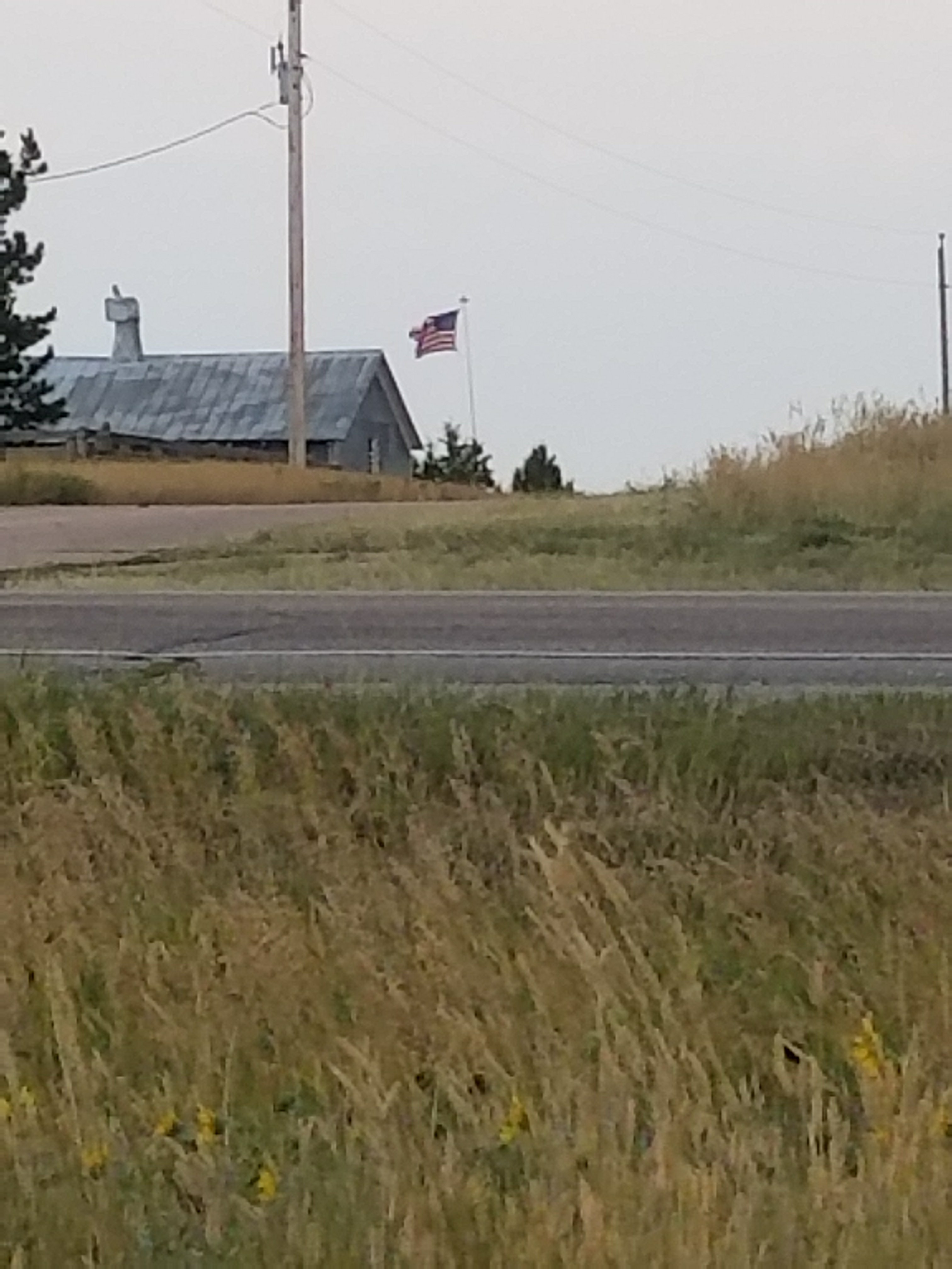 Ten miles from Lost Springs another storm hit. This time the wind was blowing so hard I had to get off of the road. Those same electric buildings that lined the Cowboy Trail were alongside the existing railroad here. Unfortunately, it was still working and locked. So, I hid behind it. Eventually a rancher pulled up and asked me what I was doing and when I told him he and I both were hiding behind the box peeking out looking at the storm. The storm was heading South so I decided to chance it. Not 2 miles down the road was another box and hiding behind it were two motorcyclists. Stacy and Jodi were coming from Sturgis and took a wrong turn back in Lusk. They were from Chicago and lived in a tiny house so we had plenty in common. We talked for nearly half an hour and by the time I left them the storm was gone and the sun setting.