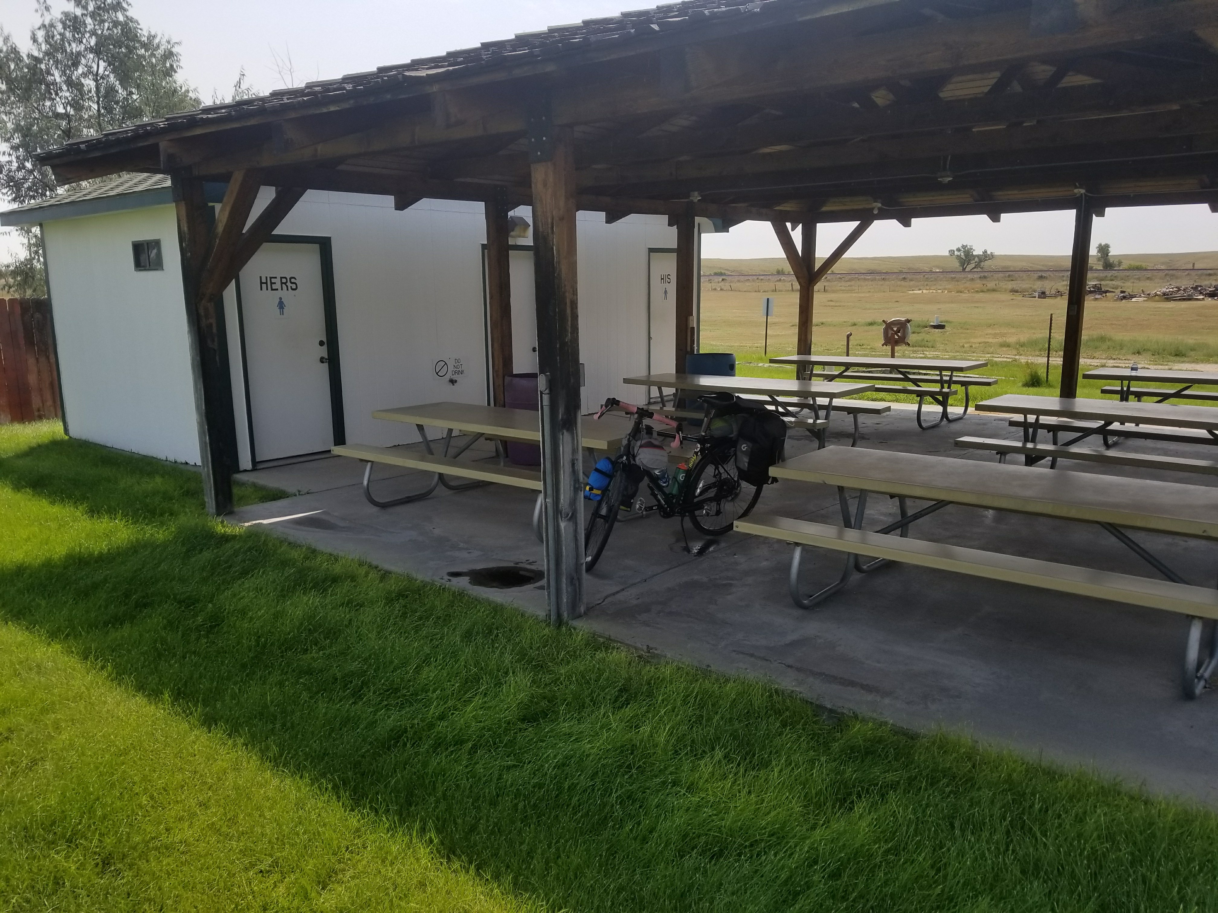 Lost Springs, WY has a population of four. One of the four directed me to their park. They had hot water, a pavilion, and the nicest grass I have ever seen. It was so nice that they had a sign up saying no camping on the grass. It was a good thing that I grabbed food from the store, but I am not buying anymore French baguettes. It was too hard to eat.