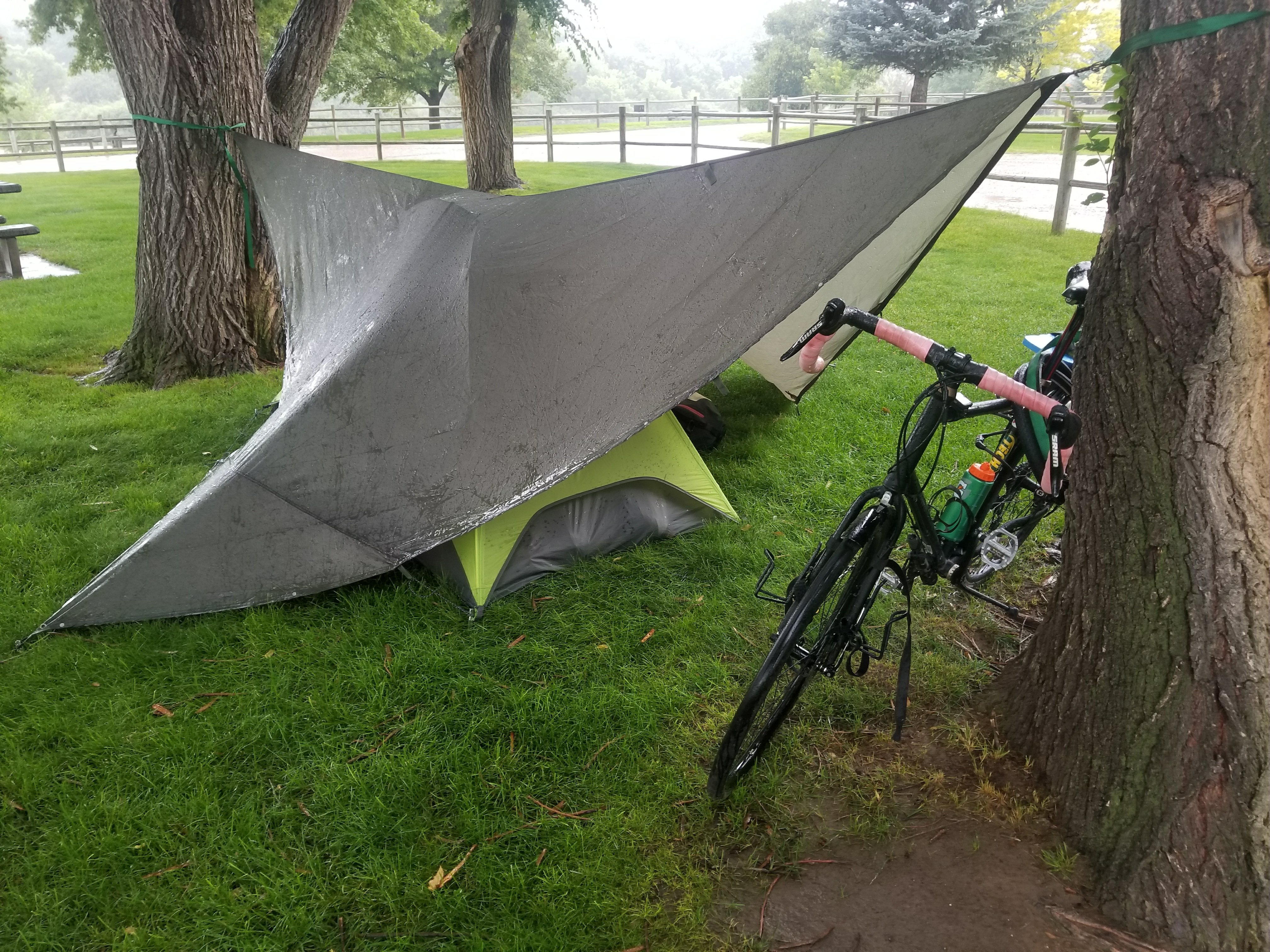 They also had a sign that read no camping on the grass, but due to the sprinkler system.  The sprinklers came on Monday, Wednesday, and Friday at 3 AM.  I scoured the park for somewhere to pitch the tent and found nothing.  I tried in the parking lot, but only bent one my stakes.  I then tried under a picnic table, but it was too short.  I then tried on top of the picnic table, but my tent was too wide.  I settled on hanging the hammock with the tarp over it.  At this point, the skies were clear and it was nice out.  Soon after, the wind picked up and the rain started.  I should mention, that I picked a spot not directly over or near a sprinkler.  The sprinkler would only hit my tarp.  When the storm came, I quickly got the tent out and set it up.  I was camping on the grass on a Wednesday and they could get over it.  I had still not acquired any more stakes and had was using some stakes for both the tent and the tarp.  It stormed, not just rained, until nearly 1 AM.  Then, at 3, the heard the sprinklers come on.