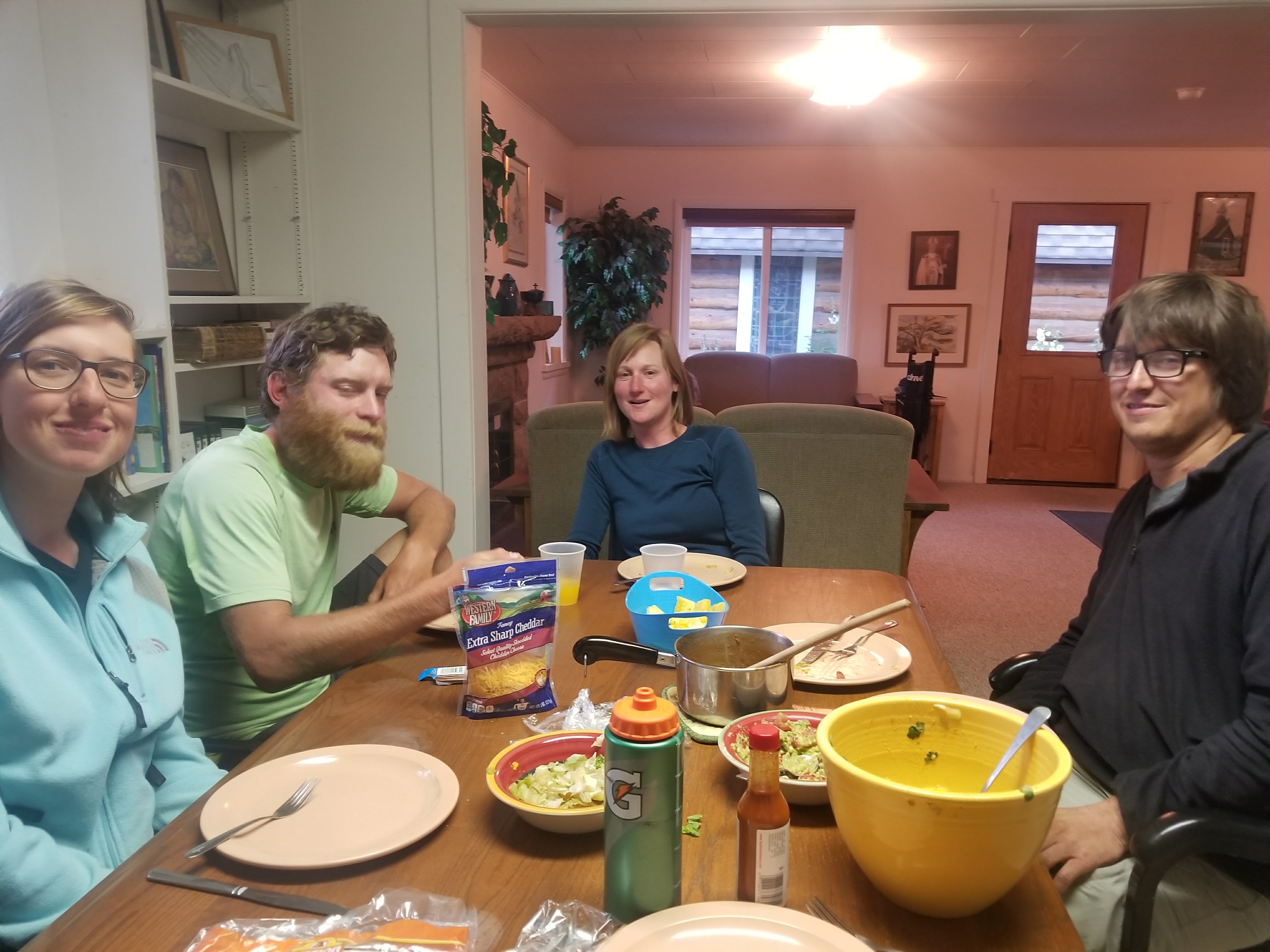 For dinner, me and two of the couples threw together a bunch of food and made burritos.  I am not the only one that will put anything inside of a tortilla and eat it.  The night went on and eventually we all settled down for bed.  Hiker midnight, as they call it, is 9 PM.  One of the guys had been preparing two loaves of bread and they came out some time after 9, so we all gathered in the kitchen to sample it.  Afterwards, two hikers, two cyclists and I all set up our beds in one of the common areas.