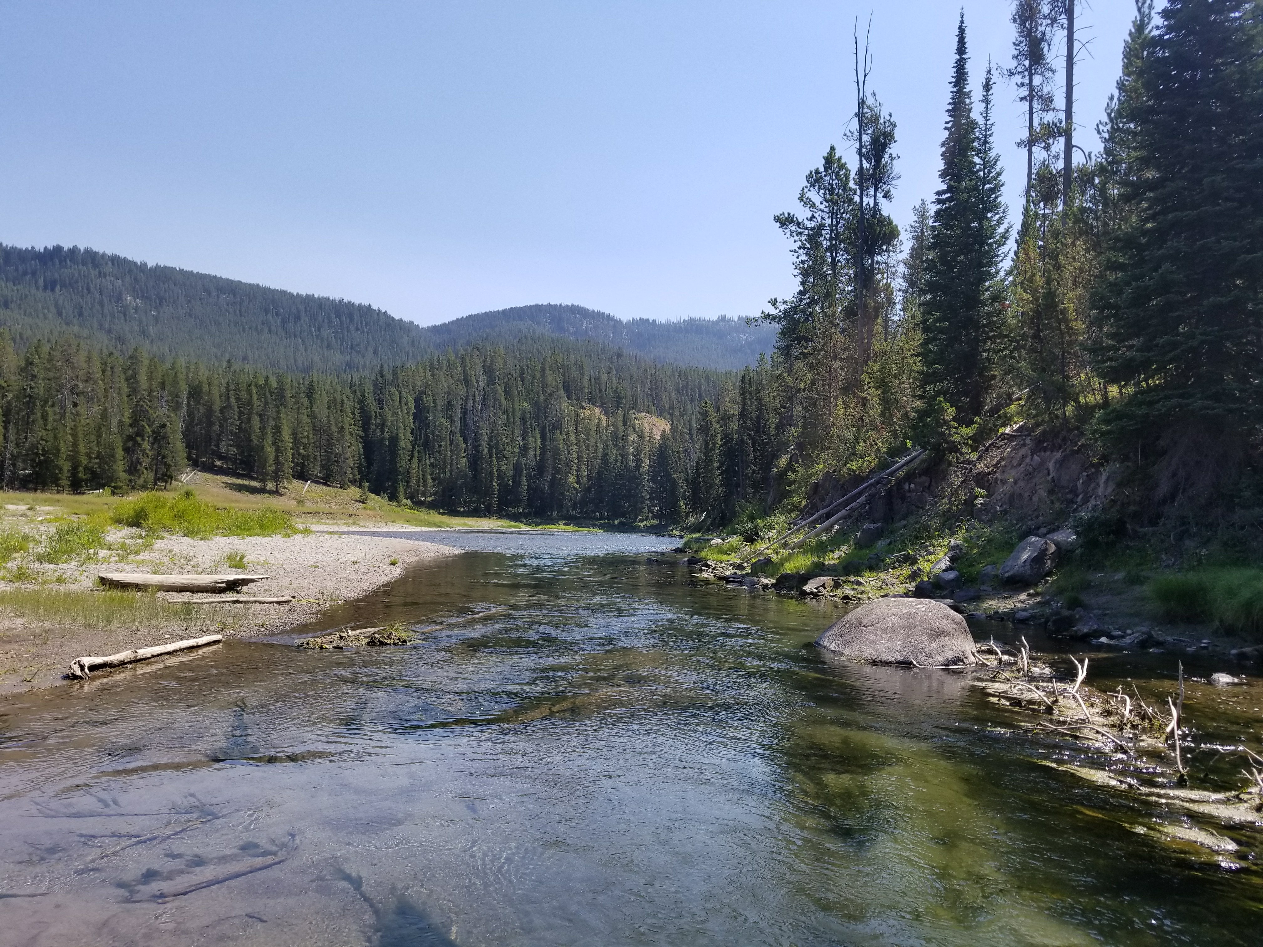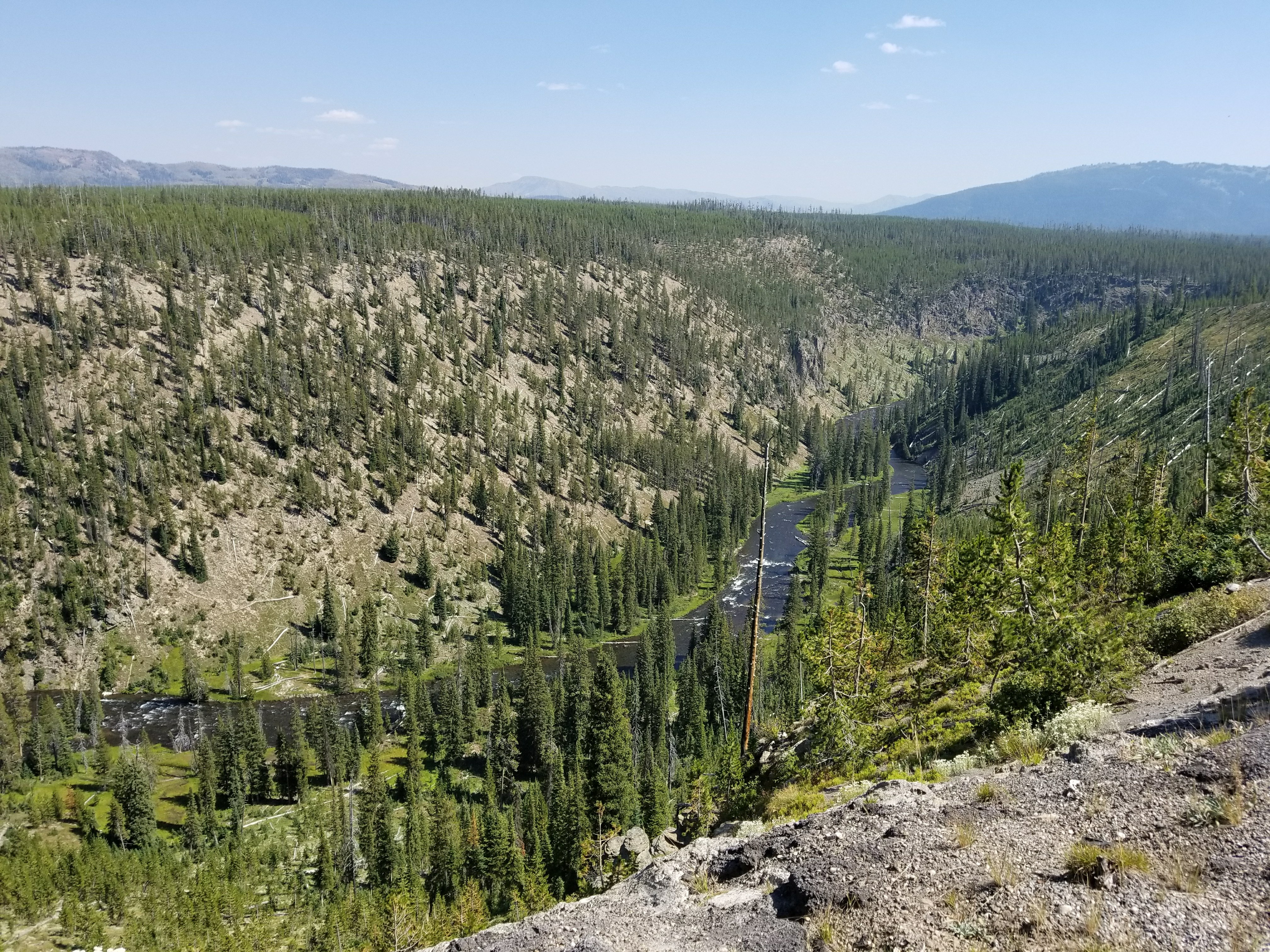 At the top of the climb the road overlooked Lewis River Gorge. From there the road followed the river until it was the same level as the road. That was the last I saw of Quinton. He planned to stay near a campground off of Lewis Lake and I wanted to push on to Old Faithful.