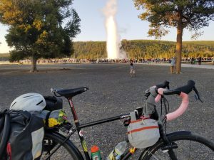 First priority in the park was food. I stopped a couple for directions and the man told me Old Faithful was about to blow and I should do that first. I am glad I did otherwise I would have missed my chance. I waited, took the photo, and then went to the visitor center to ask about camping. They told me that the campground was closed and that I would have to find somewhere else to camp. I could ride back up the mountain 15 miles or further North 15 miles and hope the campsite wasn’t full. He also suggested I check with the lodges to see if they had any vacancies. I was already spent and not about to ride any further. I told him I needed food and then I would figure it out. It was almost 8 and nearly dark after I found food and checked all of the lodges. I offered to pay to sleep in their closets, but they said no. I decided to scout around for a stealth camp.