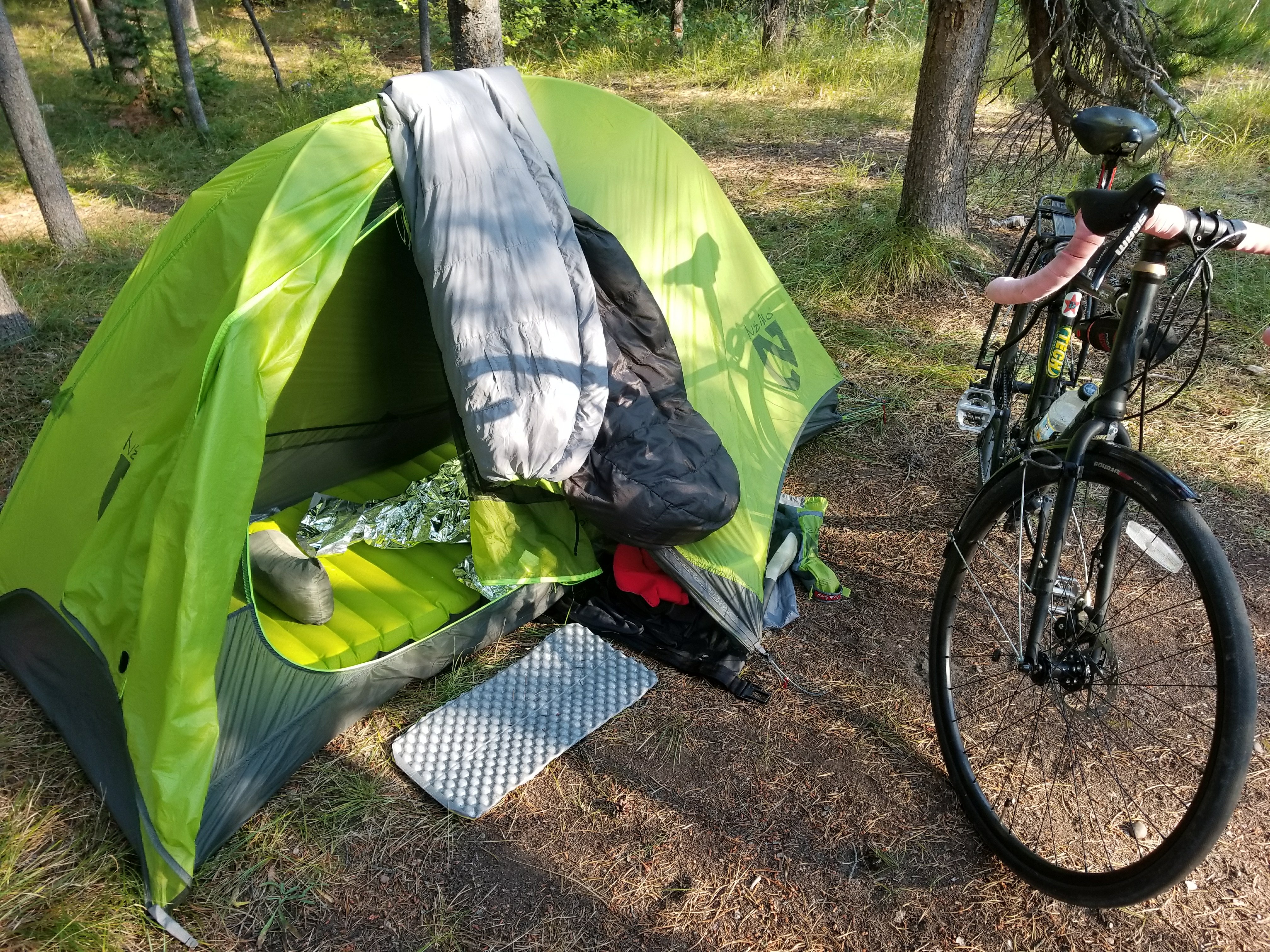Again, he was a nice guy and I’m sure he was trying to help, but he put 20 miles between me and that buffet. He also drove me through the nice part of Yellowstone and into Montana! In West Yellowstone he pulled over at the closest hotel and let me out. I then proceeded to try every hotel in town for a vacancy. Eventually I gave up and found a wooded area just outside of town to set up camp. The trees were too short to hang my food so I parked the bike away from the tent with my food strapped to it.