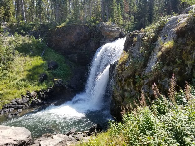 When we got back on the road the traffic was moving faster, but we were still faster. That ended after we went through the gate to Yellowstone. There was a major difference in the width of the shoulder. It went from a 3 foot shoulder to a 1 foot. The cars were now blowing by us and we started our second climb. About halfway up we went over a bridge and read a sign that said waterfall. There was also a sign that said the area was closed and that swimming and wading in the water was prohibited. So, we went down to the falls anyway.