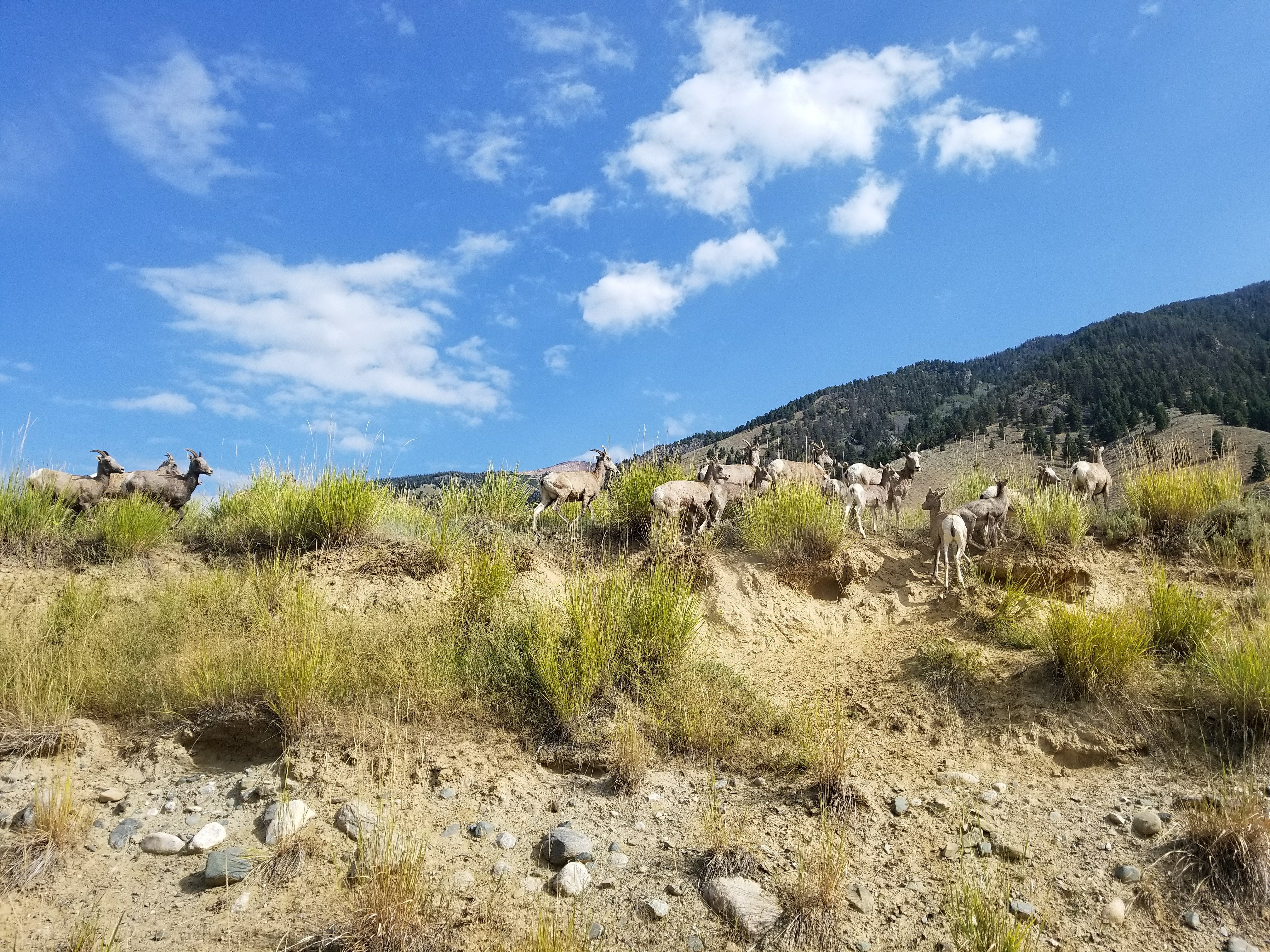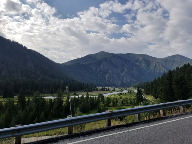 The pass was not a high one and the day looked to be an easy ride.  I caught up to Quenton about halfway up the pass.  He had stopped to eat some ramen.  I continued on and did not see him again until we stopped for the night.  The climb took us up and around Earthquake Lake.  There was a geologic visitor center there, but I felt like riding.  Coming out of the pass I went by a herd of mountain goats hanging out on the side of the road.  They didn’t budge when cars went by but they scared when I approached.