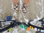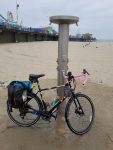 I got to the pier around 8:00 and there was not a lot going on. Nothing but a burger joint was open and I’m not sure why they were. After walking down to the end of the pier, because I felt that’s what I was supposed to do, I went down to the beach. A lifeguard was getting his stand ready and more homeless were congregating under the pier. I rolled the bike through the sand and got my Pacific Ocean photo. I realized afterwards how bad of an idea it was to get saltwater all over my bike. I then went straight to the beach shower we both got baths.