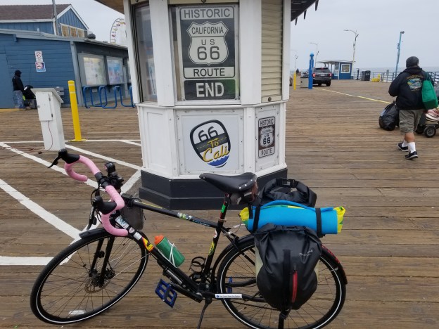 From the hotel I was about 12 miles from the Santa Monica Pier. I chose it to be my starting point because it is where Route 66 ends. On the way I went by Marina Del Ray and Venice Beach. Maybe 6 miles from the hotel my bike made a noise I recognized from last year. What took me 30 minutes to figure out last year was immediate this year. The bolt holding the rack to the frame had come loose. No problem though! I just put it back in. Turned out to be a problem: the braze on in the frame had stripped just enough that the short bolt could not grab hold. I borrowed a bolt from the front fork and used it with no spacer. Hopefully it will hold…